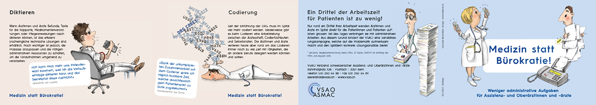 Gesamtkonzept und Gestaltung der Kampagne “Medizin statt Bürokratie” (weniger administrative Aufgaben für Assistenz- und Oberärztinnen und -ärzte) für den Verband Schweizerischer Assistenz- und Oberärztinnen und -ärzte VSAO, bestehend aus einem Würfelspiel mit Spielanleitung, Leporello A6 und einer Journalbeilage
